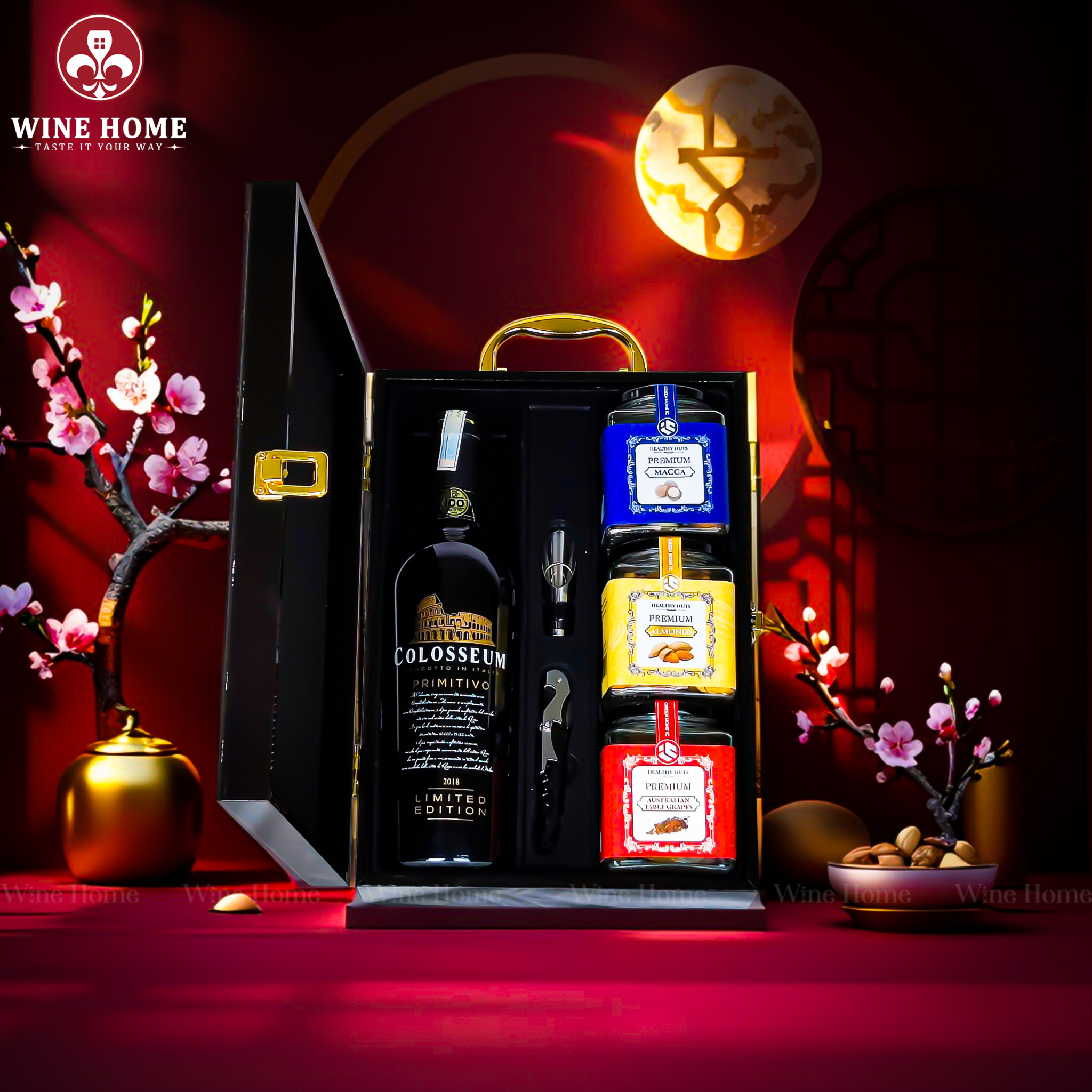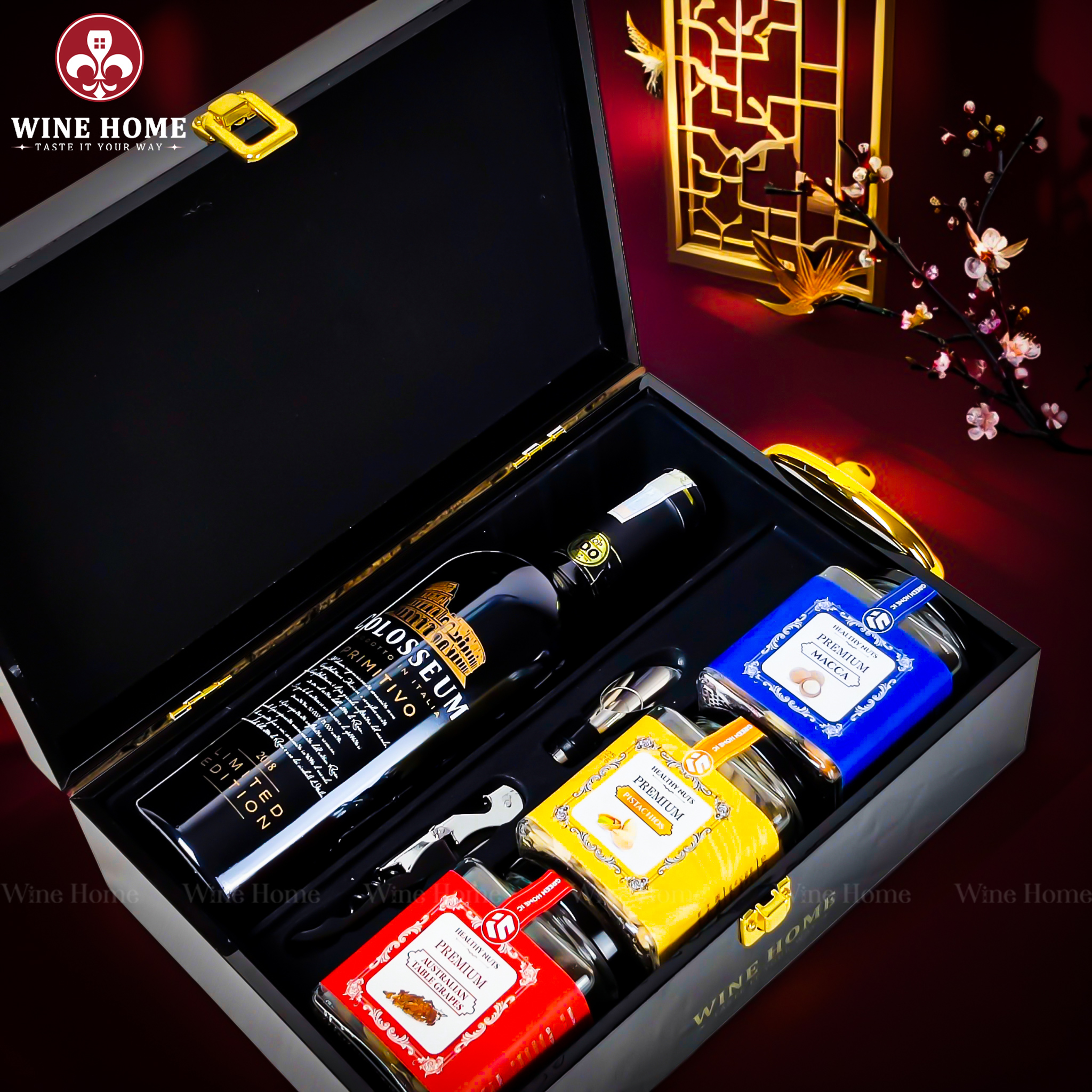 Hộp Quà Tết 2026 – Phiên Bản Hộp Gỗ Sơn Mài Quai Xách Dọc bao gồm: